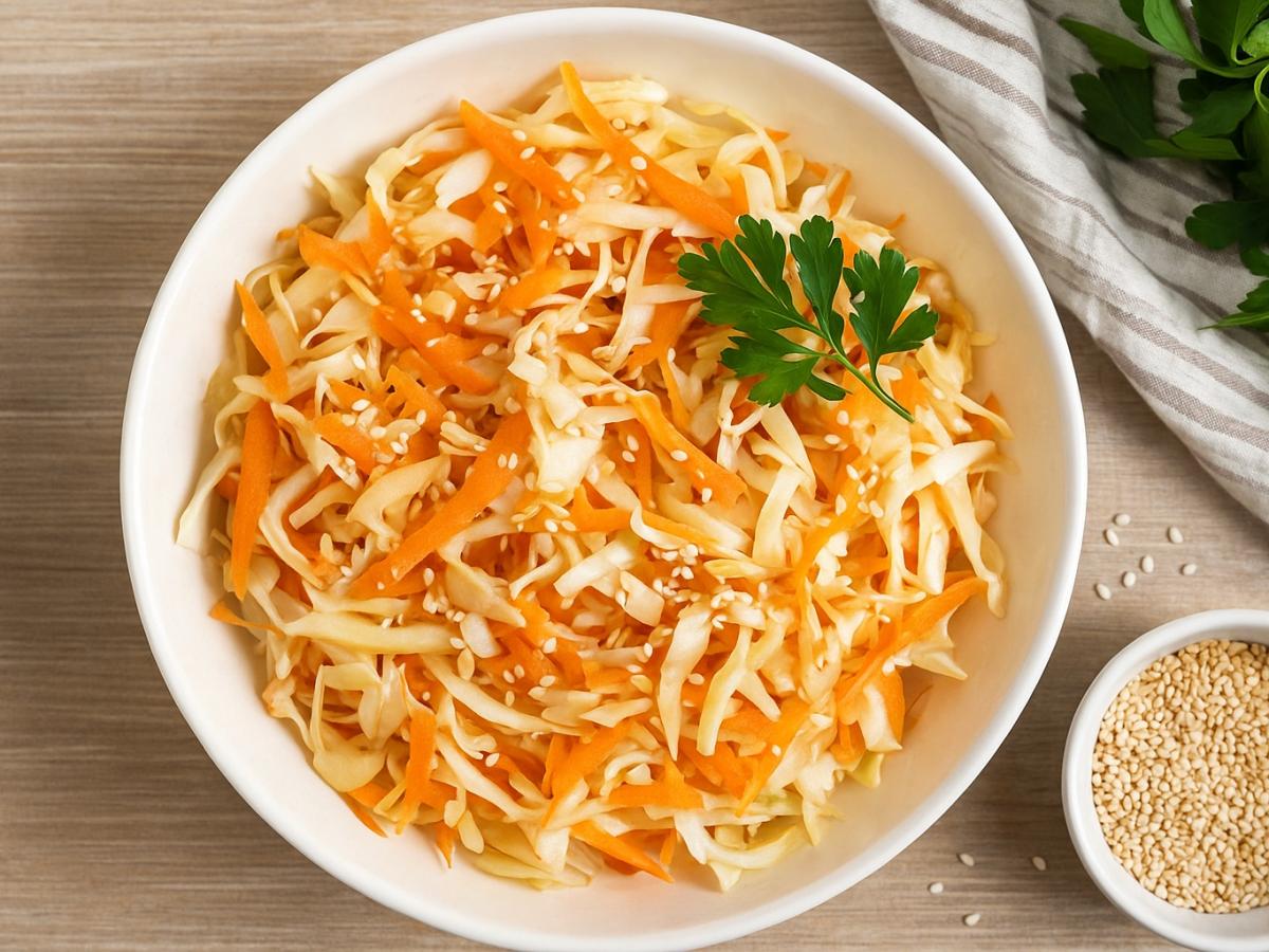 Предварительная подготовка капусты. Это небольшой, но очень важный секрет. Выдавите в миску с капустой сок половины лимона, добавьте небольшую щепотку соли и слегка помните капусту чистыми руками. Не нужно усердствовать, как для квашения — достаточно просто слегка сжать массу, чтобы она пустила немного сока. Это смягчит жестковатые волокна молодой капусты, сделает ее более нежной и позволит ей лучше впитать заправку.