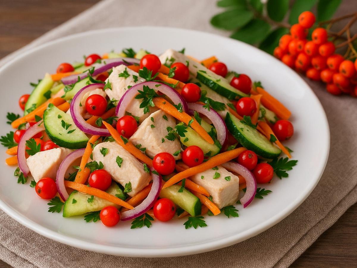 Главное достоинство — баланс. Жареная курица делает салат сытным, но овощи придают лёгкость. В отличие от традиционных мясных салатов, где всё смешивается с тяжёлой заправкой, здесь можно выбирать: майонез, сметана, йогурт или даже оливковое масло. Болгарский перец добавляет сочность и яркий цвет, а свежие огурцы создают хруст. Это один из тех рецептов, который легко адаптируется под вкусы семьи.