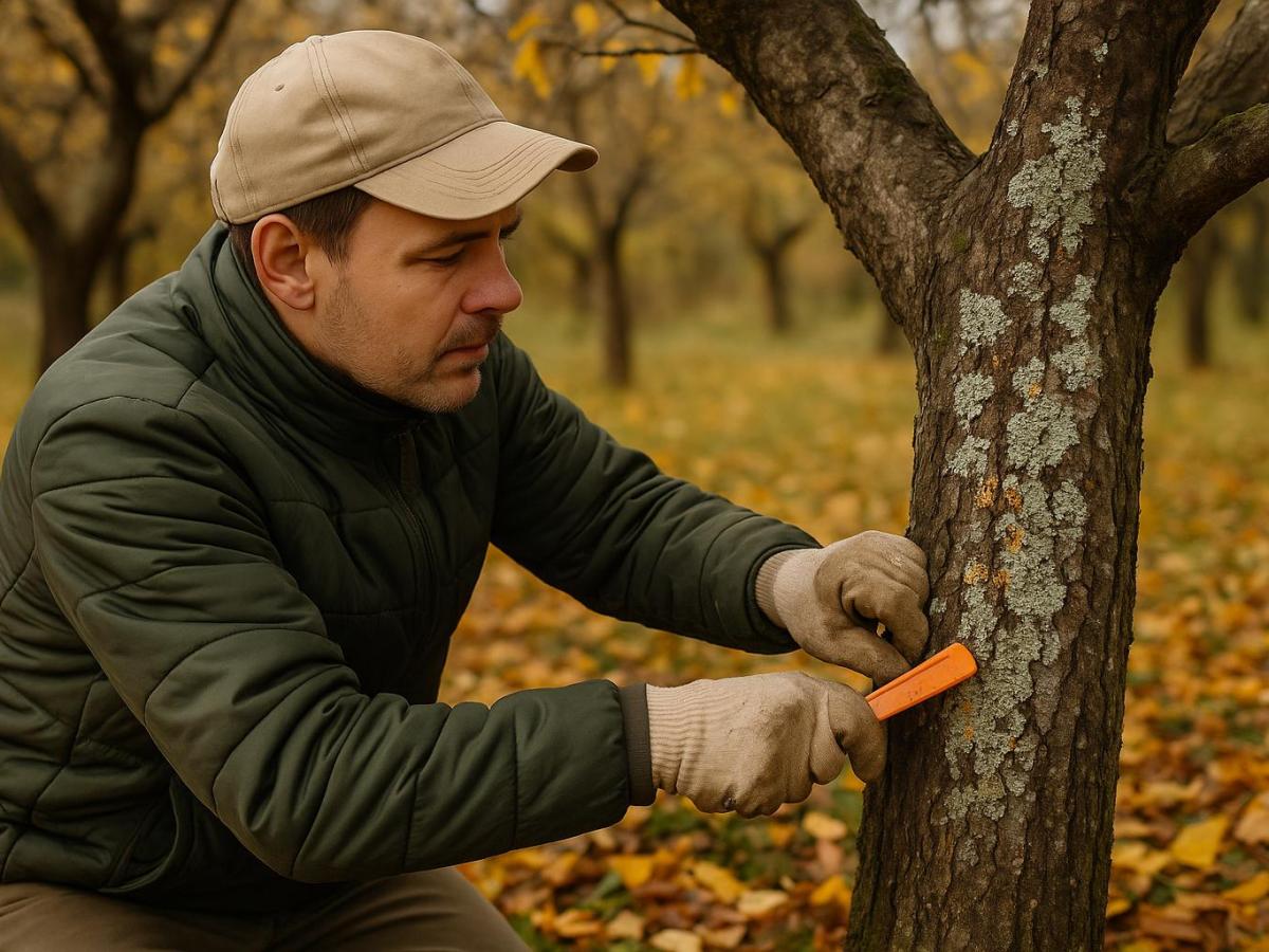 Если лишайники сильно прицепились, примените садовый нож или деревянный скребок, но будьте осторожны, чтобы не повредить кору.