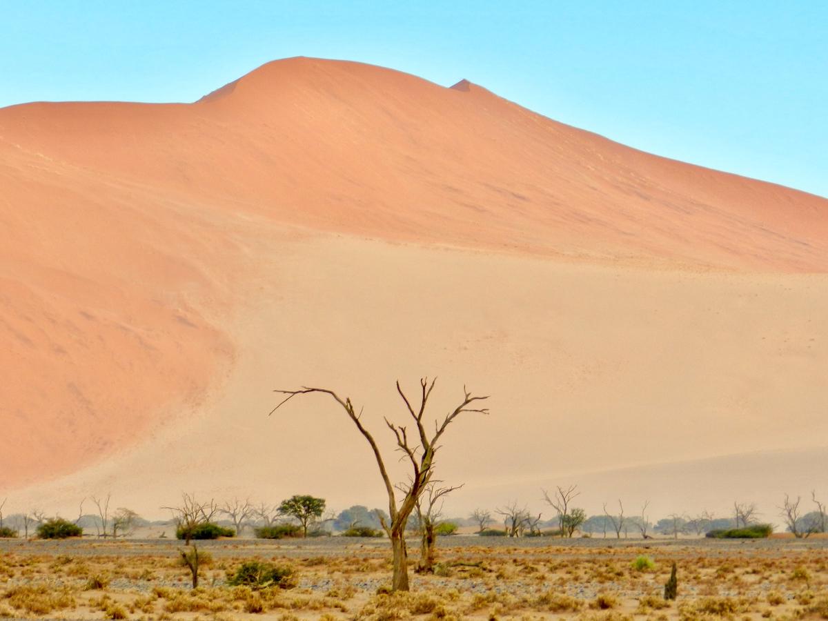 В центральных районах дюны старше и темнее: их красно-терракотовый цвет связан с окислением железа в песке. Ближе к океану песок светлее — его постоянно приносят реки и ветры. Пустыня остаётся живой системой, где одни дюны разрушаются, а другие возникают вновь.