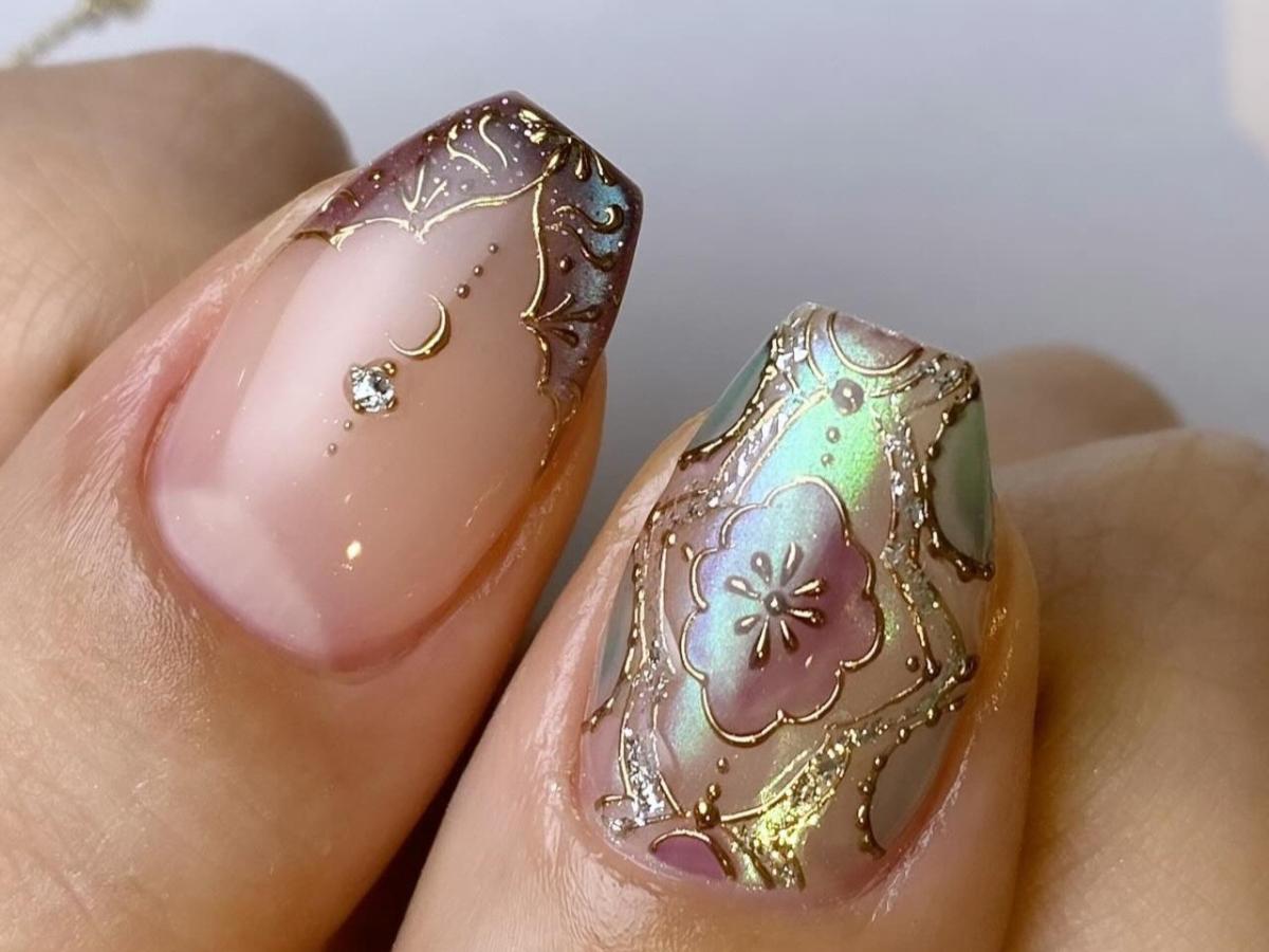Радужная отделка напоминает поверхность жемчужины или мягкое сияние кристаллов. Она создаётся за счёт сочетания полупрозрачных оттенков, световых бликов и микроскопических мерцающих частиц. На ногтях это выглядит утончённо и идеально подходит для сезона, в котором ценится спокойная роскошь и ненавязчивое сияние.