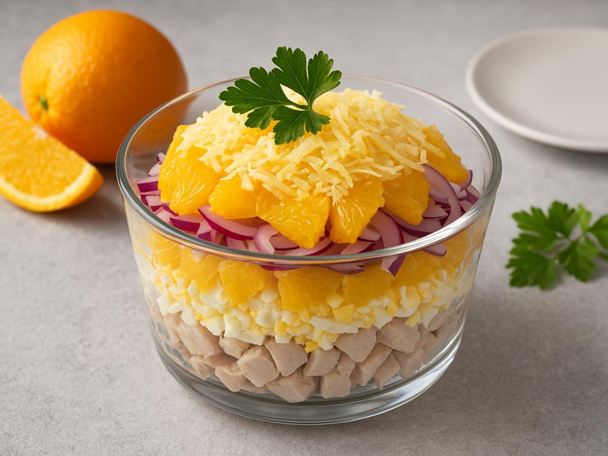 Этот салат многослойный, красиво держит форму благодаря кулинарному кольцу, а сочетание цитрусовой кислинки и мягкого сыра делает вкус праздничным и необычным. При этом ингредиенты простые, доступные и полезные: индейка даёт белок, пекинская капуста добавляет хруст, а апельсин обеспечивает витаминность и свежий аромат.