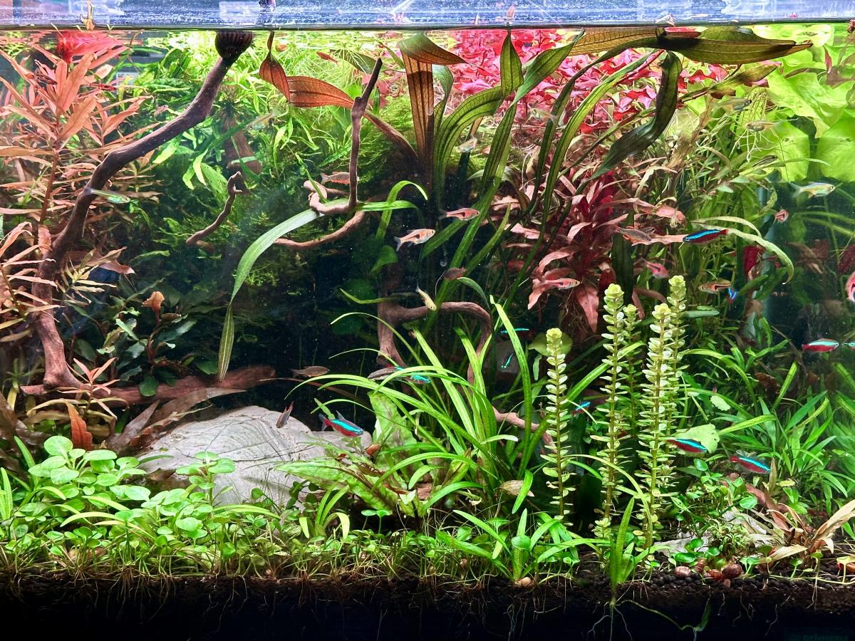 Скалярии ценят баланс: им нужны и густые заросли растений для укрытий, и открытое пространство для плавания. Хорошо себя показывают длинностебельные культуры — эхинодорус, валлиснерия, кабомба.