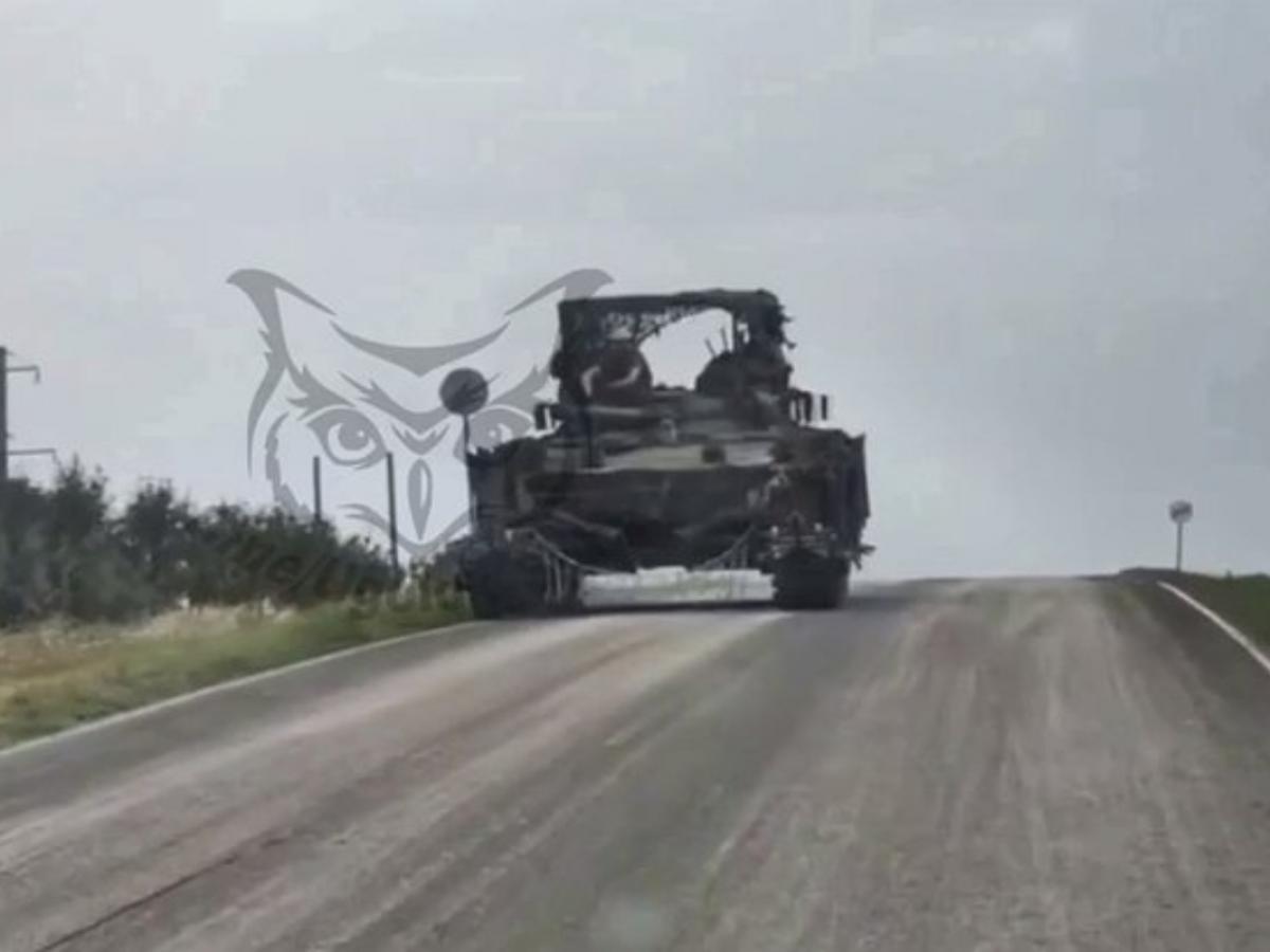 Российские военные доработали боевую машину, установив на неё самодельный колейный трал, который был прикреплён к буксировочным крюкам и снаряжению для самоокапывания.