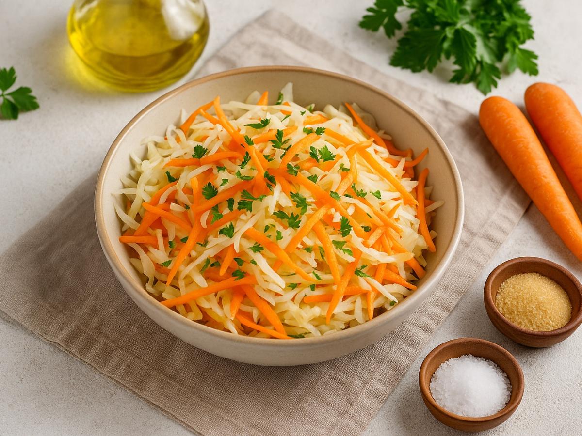 Не солите капусту заранее — она выделит сок и салат станет водянистым.
