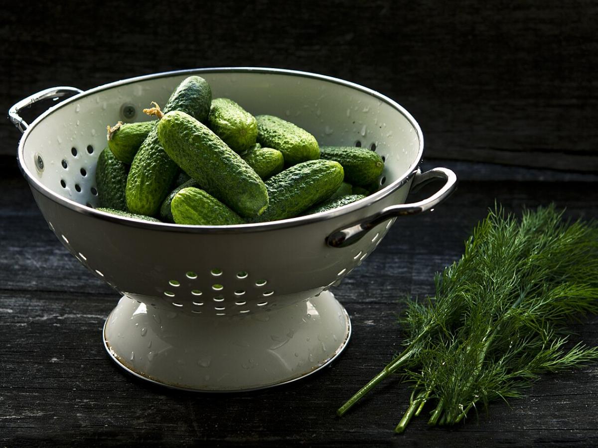 Огурцы промойте под холодной водой и обсушите. Нарежьте кружочками — толщиной примерно 0,5 см. Чеснок измельчите ножом или пропустите через пресс. Укроп можно порезать или использовать целиком — зависит от ваших предпочтений.