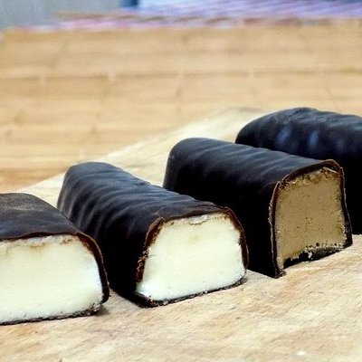- Замороженные творожные заготовки вынуть из формы, насадить на шпажки и глазировать в шоколаде.