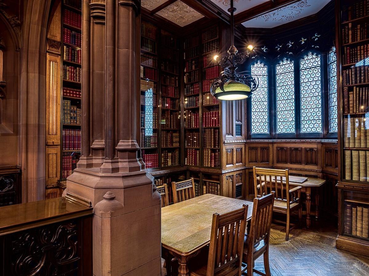 Главные детали — хрустальная люстра, ковер, камин и библиотека. Для отделки стен используют венецианскую штукатурку или тканевые покрытия, а мебель выбирают из ценных пород дерева — ореха, дуба, красного дерева.