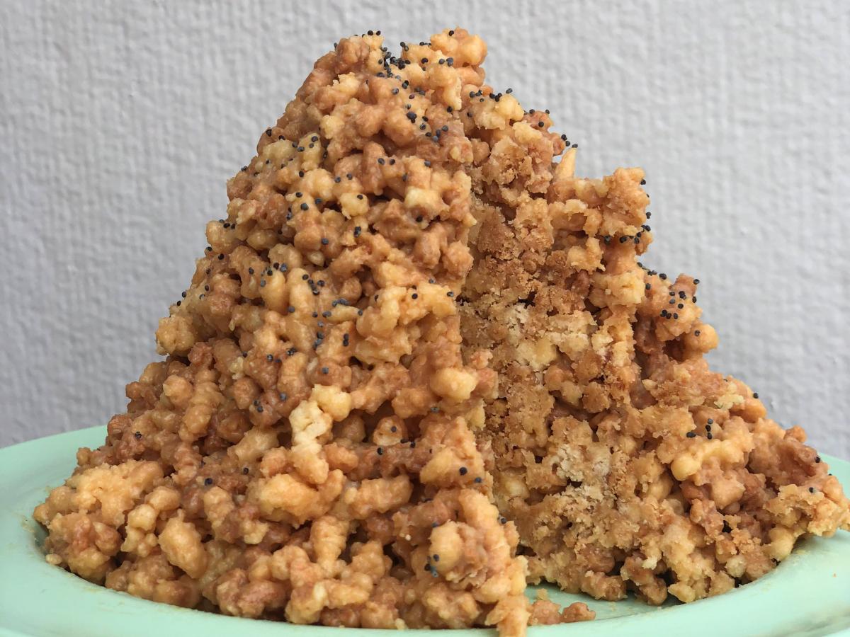 Смешайте всё - печенье, орехи и крем должны хорошо соединиться. Сформируйте "муравейник" — выложите массу горкой, утрамбуйте и обсыпьте маком. Охладите 4 часа — чтобы торт хорошо пропитался и держал форму.