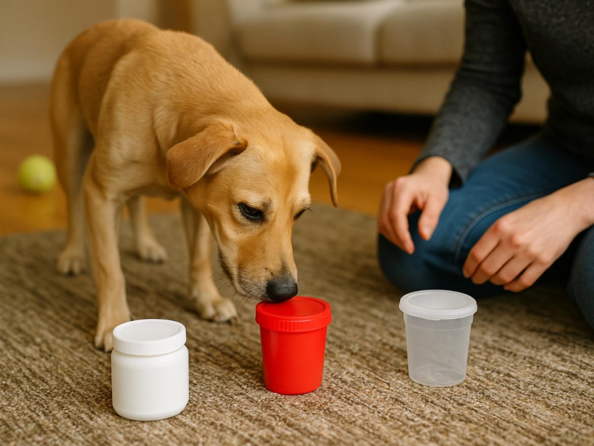 Покажите собаке лакомство, дайте понюхать и спрячьте его под одним контейнером. Попросите искать. Если питомец колеблется, слегка поднимите крышку или постучите по ней, чтобы подсказать. Как только он найдёт лакомство — похвалите. Главное правило: первые задания должны быть лёгкими, чтобы не потерять интерес.