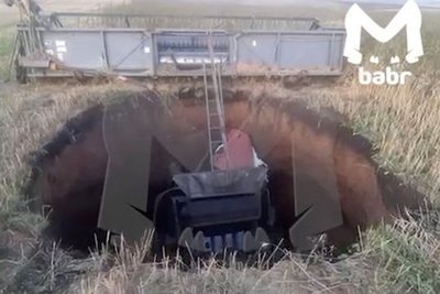 В Иркутской области комбайн провалился в большую яму посреди поля. Видеозапись последствий происшествия была опубликована в телеграм-канале Babr Mash.